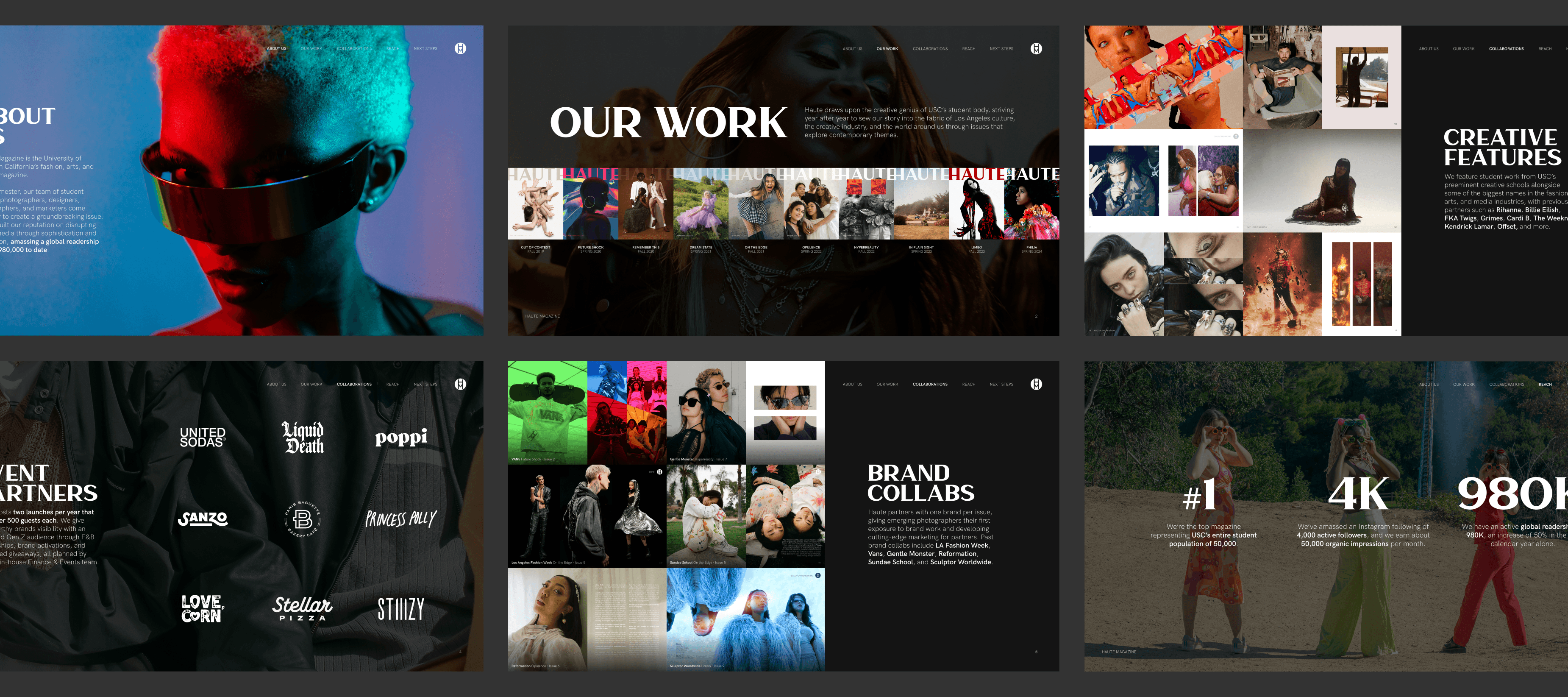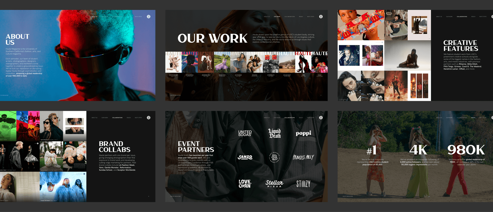 Haute Magazine is USC’s largest magazine. As Creative Director (President), I led Haute's staff of 15 directors and 70 creatives to produce Haute’s 9th and 10th issues, each over 360 pages. I defined theme and visual direction, managed partnerships with collaborators including Liquid Death and Princess Polly, and drove campaigns reaching 50K people and bringing 500+ guests to each of Haute's launches.