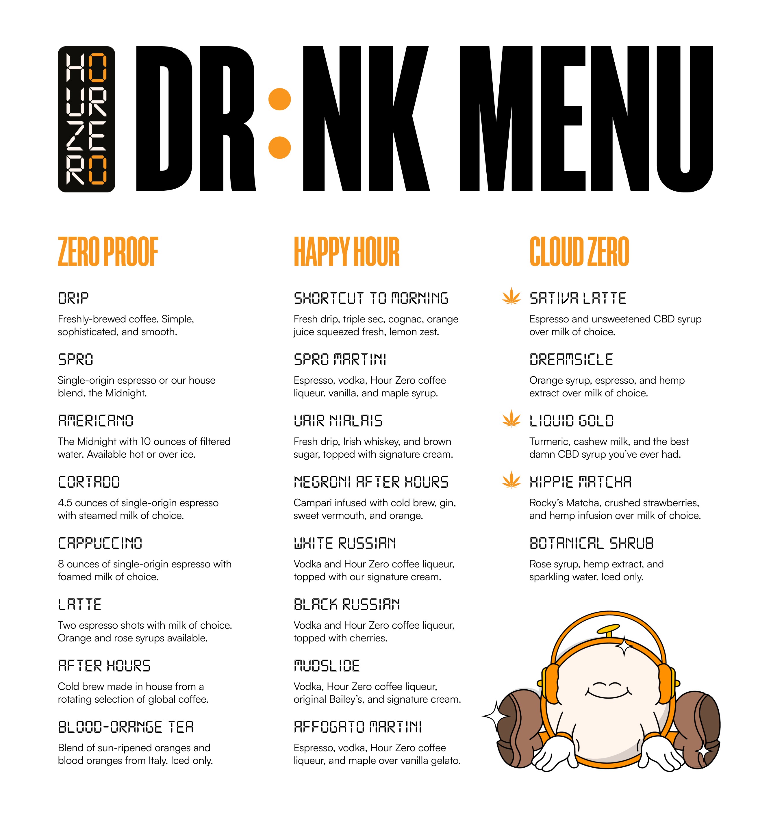 Hour Zero is an experience-based espresso bar that bottles all kinds of feelings through espresso drinks, cocktails, and CBD-infused beverages. Open from 12 AM to 12 PM, Hour Zero reimagines the role of a traditional bar by bringing stimulants, depressants, and everything in between together under one roof.