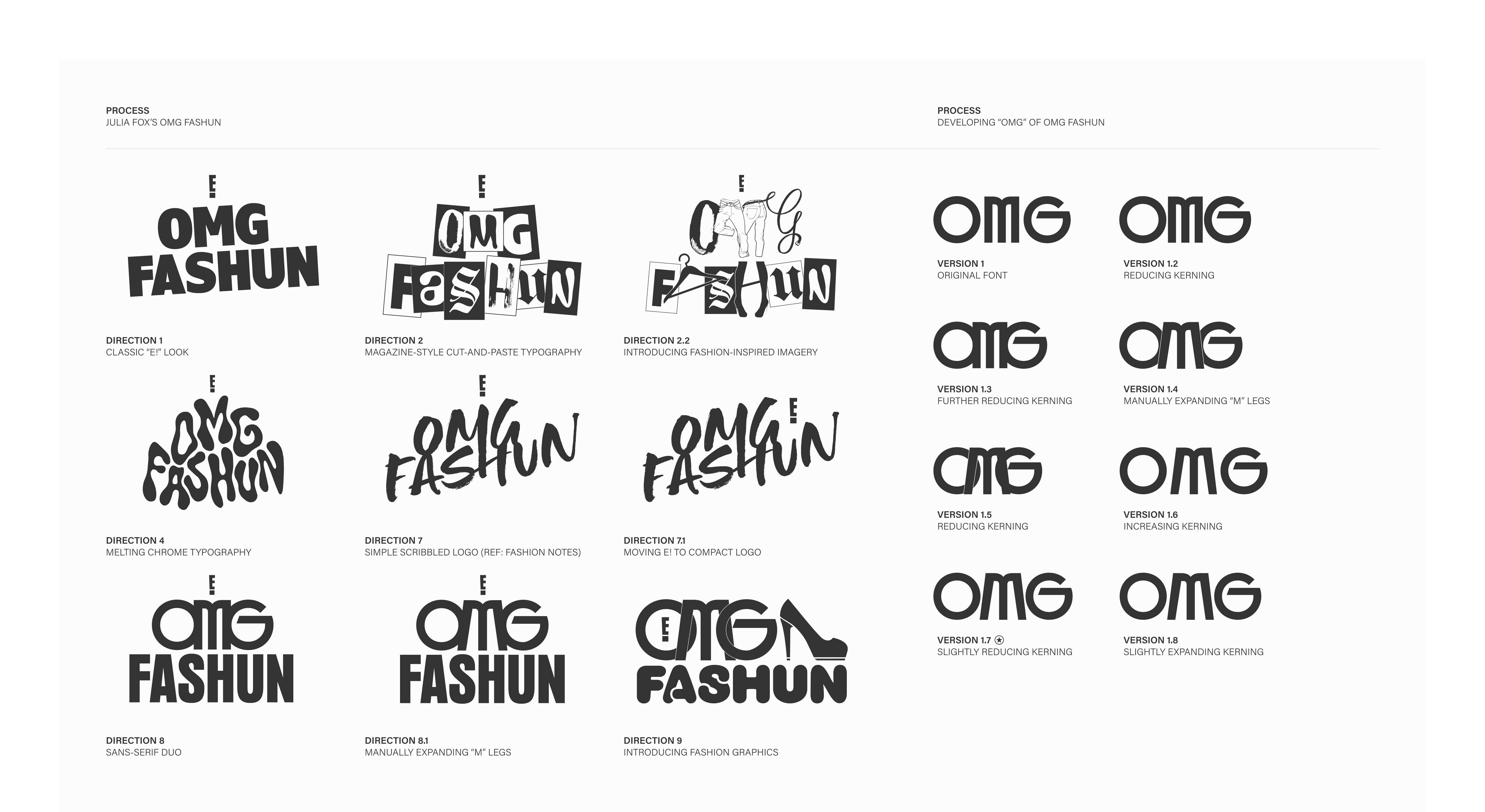 OMG Fashun follows "disrupters" crafting looks intended to make "fashion's gatekeepers squirm," so I wanted to create a logo that walked the line between glamor and chaos. I began with a classic Art Deco typeface to connect the logo to luxury and spectacle, then manually exaggerated curves, angles, and proportions to create an "OMG" that felt expressive but could scale.