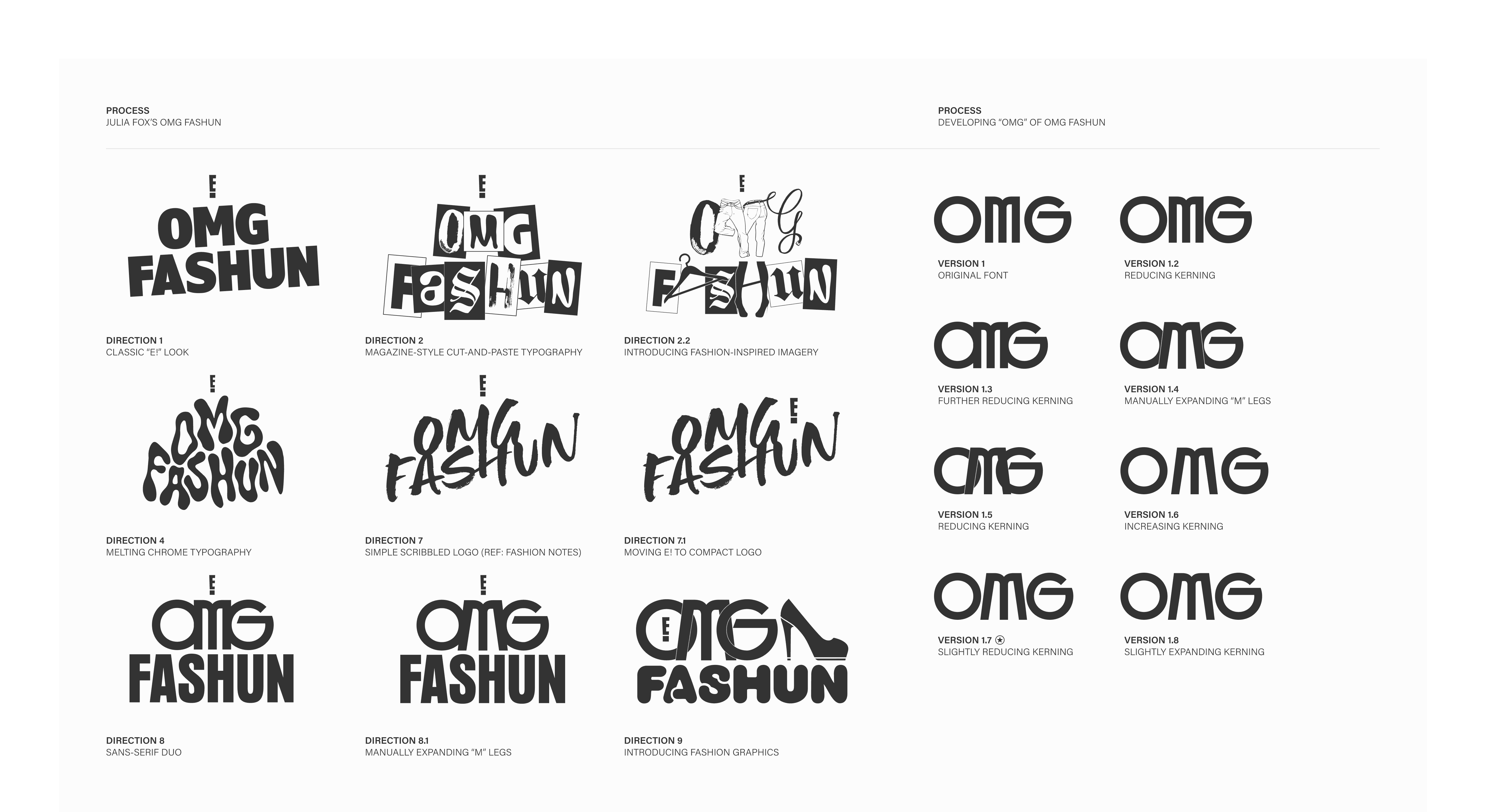 The show follows “disrupters” crafting bold, unusual looks, so I wanted to create a logo that walked the line between glamor and chaos. I began with a classic Art Deco typeface to connect the logo to luxury and spectacle, then manually changed curves, angles, and proportions to create an “OMG” that felt expressive but could scale.
